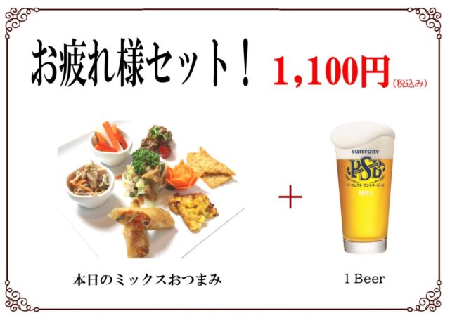 本日のミックスおつまみと生ビール(パーフェクトサントリービール)をセットで1100円としました。